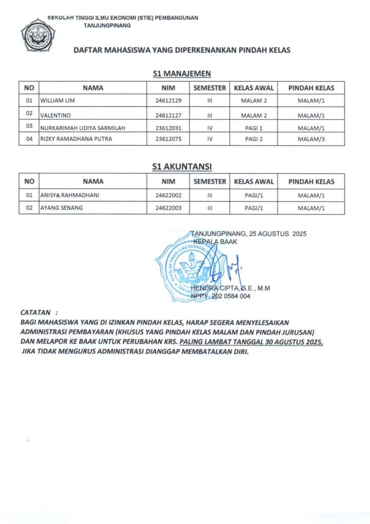 Daftar Nama Persetujuan Pindah Kelas Prodi Akuntansi dan Manajemen Tahun Akademik 2025/ 2026 terlampir: