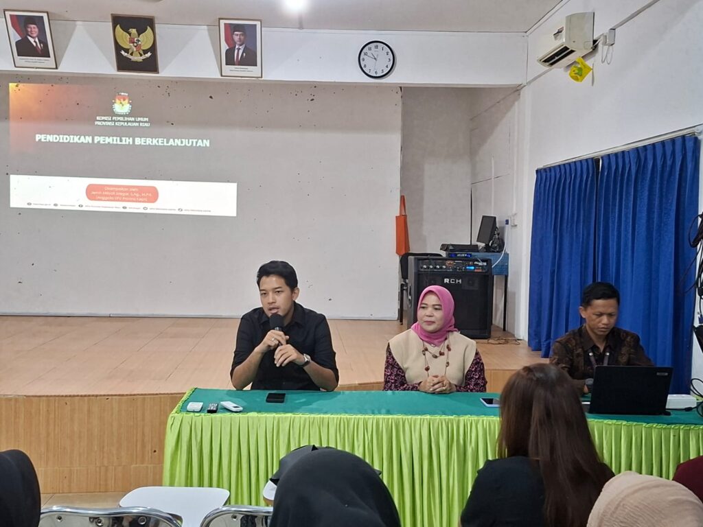 Sesi utama diisi oleh Ibu Jernih Mikiyati Siregar, S.Ag., M.Pd., anggota KPU Provinsi Kepulauan Riau. Dalam paparannya, beliau menyampaikan urgensi pendidikan pemilih berkelanjutan sebagai fondasi demokrasi yang sehat. Beberapa poin penting yang disampaikan meliputi: